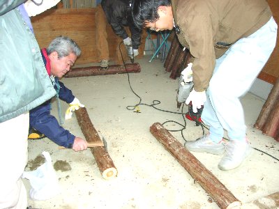 種を原木に植え付ける作業はいたって簡単です。電動ドリルで穴を空け種駒を金づちでたたき込むだけですね。