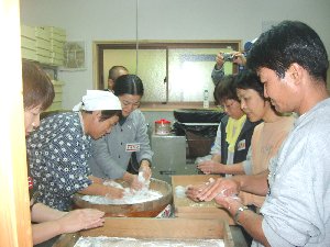 二日目は、パン焼きを希望した2人は早朝からパン屋さんで1日修行です。残りの6人は農作業をやる予定ですがどしゃ降りの雨、そこでお昼に食べる美里町の食材を使ったお弁当を作る事にしました。お土産のよもぎ餅も