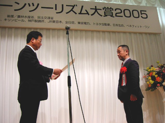 さて、「グリーンツーリズム大賞2005」(毎日新聞社主催)の優秀賞に民宿ひらいが選ばれ 20日授賞式に行ってきました。応募総数223軒の中の4軒(大賞1軒、優秀賞3軒)の一つに選んで頂いたわけで天にも昇るような嬉しい出来事です。