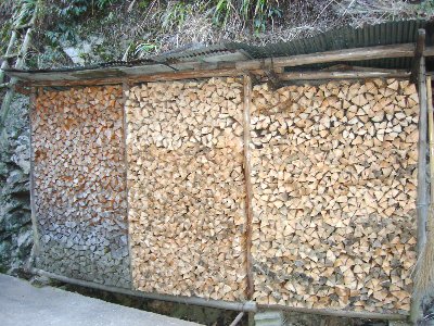 山から木を切り出してきて、適当な長さに裁断し更に薪割りをして薪棚に積並します。山から木を切り出すのはとても重労働、薪割りも汗をかきますね。(出来上がった薪は 2〜3年乾燥させて初めて燃料になるんですよ。)