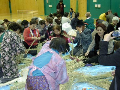 とある老人クラブの皆さんですが80才を過ぎた方も何人もおられました。そして、初めてわらを触ってみて「もっと柔らかい物だと思っていた。」「この年になってもとても面白かった。」等ないくつ何十になっても